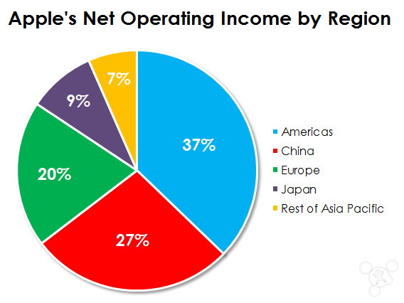 2015年蘋果在中國獲得巨大成功后,現(xiàn)在蘋果公司的凈營業(yè)收入有超過1/4的比例都來自大中華區(qū),比歐洲市場多出7%,比美洲市場略低,美洲市場的為37%。
