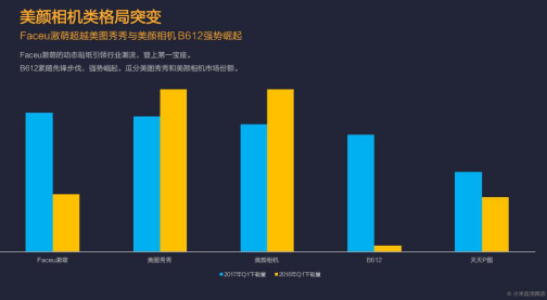 智能手機的拍照便攜性和用戶愛美的天性孕育出了美顏相機行業(yè)。從下載量分布看,傳統(tǒng)兩強美圖秀秀和美顏相機同比2016年都出現(xiàn)明顯的下滑,反倒是“Faceu激萌”憑借動態(tài)貼紙功能迅速籠絡(luò)用戶,登上了下載量第一的寶座。另外值得注意的是,過去的第一季度,B612美顏應(yīng)用雖然暫列第四位,但同比增長非常迅猛,大有殺入前三名的可能。