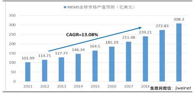 據(jù)Yole development預(yù)測(cè),2016-2020年MEMS傳感器市場(chǎng)將以13%年復(fù)合增長(zhǎng)率增長(zhǎng),2020年MEMS傳感器市場(chǎng)將達(dá)到300億美元,市場(chǎng)空間巨大。