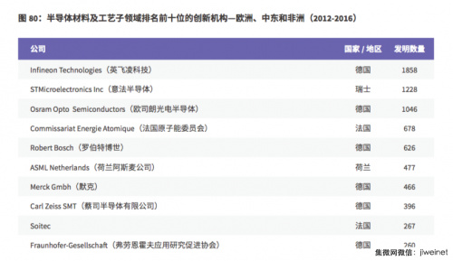 從半導體材料及工藝子領(lǐng)域歐洲、中東和非洲十大創(chuàng )新機構(2012-2016)榜單可以看到,英飛凌科技占據榜首,該公司在 2012 到 2016 年的發(fā)明數量為 1858 件。其中,德國共有六家機構入圍(包括英飛凌、歐司朗光電、羅伯特博世、默克、蔡司半導體和弗勞恩霍夫應用研究促進(jìn)協(xié)會(huì )),其次是法國(CEA 和 Soitec),瑞士(意法半導體)和荷蘭(ASML)。