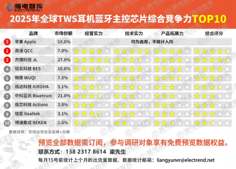 從榜單上看,高端市場和中低端市場呈現(xiàn)兩極分化,各有王者,分別是蘋果和杰理,分別占有14%和27%的市場份額。