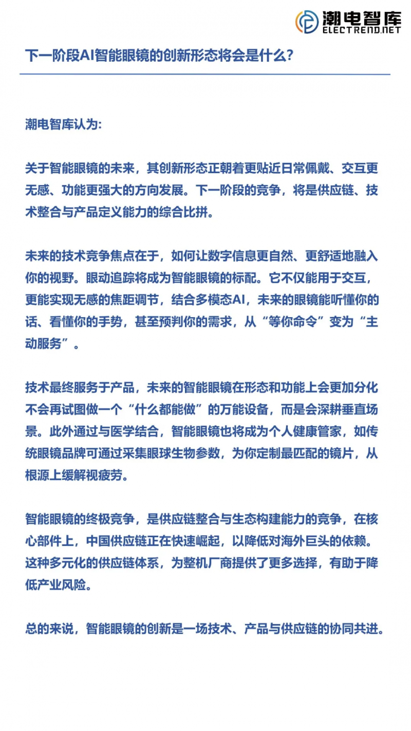 潮電智庫認為:關(guān)于智能眼鏡的未來,其創(chuàng)新形態(tài)正朝著更貼近日常佩戴、交互更無感、功能更強大的方向發(fā)展。下一階段的競爭,將是供應(yīng)鏈、技術(shù)整合與產(chǎn)品定義能力的綜合比拼。